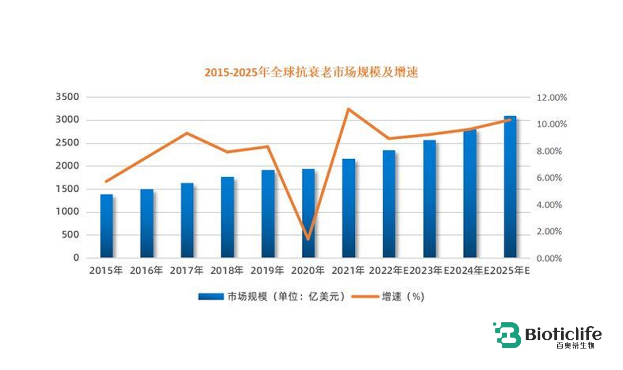 从经济层面看,这一转型同样充满吸引力。根据 Frost & Sullivan 数据,2025年全球抗衰市场规模已突破 3000 亿美元,其中细胞级抗衰占比不到 8%,但预计未来五年复合增长率将超过 20%。这意味着,细胞抗衰是抗衰经济中最具扩张潜力的板块。